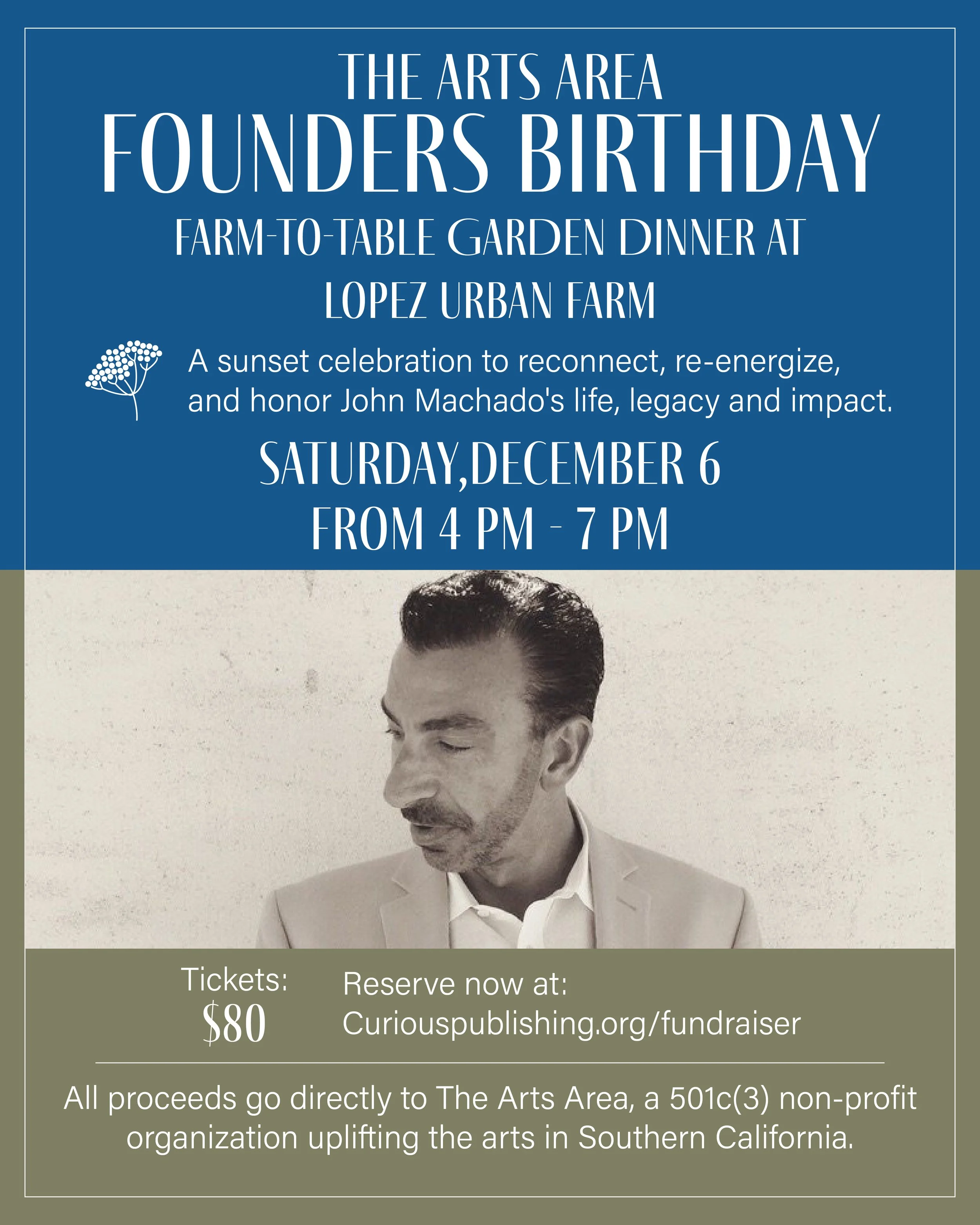You are invited to make a contribution in honor of John Machado’s legacy and larger-than-life personality championing the arts in the Inland Empire. Help by sponsoring our upcoming in-person dinner at Lopez Urban Farm, or donate any amount to help us reach our goal of $4,000